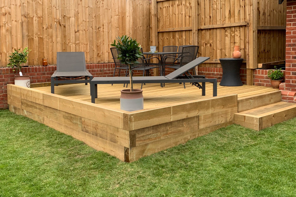 Lee purchased 30 of our 2200mm sleepers to create a decking area and also some raised beds/borders by utilizing the natural slope of his garden in another section. Thanks for sharing Lee the decking looks fantastic!